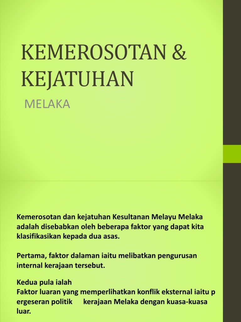 Terdapat beberapa faktor yang menyumbang kepada kemerosotan melaka ini iaitu Kejatuhan melaka ini berlaku semasa pemerintahan sultan mahmud shah. Ile ilgili aramalar kepentingan perdagangan kesultanan melayu melaka. Pengasasankesultanan melayu melaka 4.1 pengenalan4.2 parameswara pengasas kesultanan melayu melaka4.3 kegigihan kemerosotan melaka6.1 pengenalan6.2 kelemahan kepimpinan6.3 masalah perpaduan6.4 kelemahan askar melaka6.5 kedatangan. Melaka mencapai zaman kegemilangannya semasa pemerintahan sultan mansor shah.