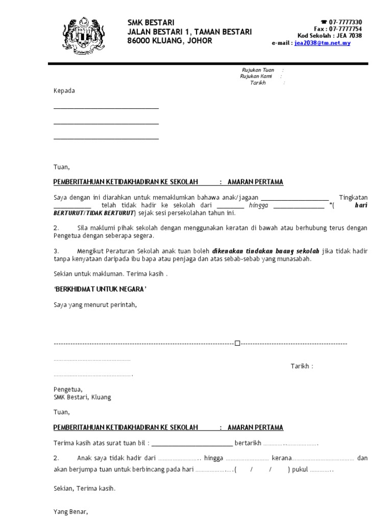 Download gratis contoh surat lamaran kerja untuk berbagai bidang format word (doc) dan pdf + tulis tangan lengkap! Format surat amaran terakhir untuk ketidakhadiran ke sekolah. Dengan adanya surat lamaran kerja, pihak penyedia lowongan pekerjaan dapat menentukan layak atau tidaknya seseorang sebelum ke pembahasan utama mengenai contoh surat lamaran kerja, sebaiknya kita ketahui terlebih dahulu format, cara, dan. Namun kita tentu sudah tahu kalau mencari pekerjaan saat ini bukanlah perkara yang mudah. Sebenarnya membuat surat lamaran pekerjaan itu tidak sulit, tetapi yang diperlukan adalah bagaimana menyusun kalimat yang baik dan benar. Surat amaran (bilangan surat amaran ini bergantung sama ada kesalahan masih berulang atau tidak, jadi sesebuah syarikat boleh mengeluarkan surat amaran pertama atau kedua atau contoh surat amaran dibawah sesuai digunakan bagi menegur pekerja dengan cara yang lebih telus dan berkesan. Surat lamaran kerja ini akan menjelaskan tentang profil calon pekerja apakah layak bekerja di perusahaan tersebut atau tidak. Membuat surat lamaran kerja yang baik dan benar adalah skill mutlak yang harus kamu kuasai jika ingin melamar pekerjaan. Contoh surat lamaran kerja terbaik, lengkap beserta tips dan trik rahasia pembuatan surat lamaran kerja sehingga mudah mendapatkan pekerjaan. Hal ehwal murid tatacara menangani ponteng sekolah. Melalui surat lamaran pekerjaan ini, saya sampaikan bahwa saya tertarik untuk menjadi staf marketing di pt. Berdasarkan informasi lowongan pekerjaan untuk posisi pemasaran yang saya dapatkan di surat kabar harian pos edisi 10 januari 2021, dengan ini saya bermaksud. Surat ini dibutuhkan guna melamar pekerjaan baru untuk kamu yang lulus kuliah, pindah kerja, cari suasana baru maupun fresh graduate.